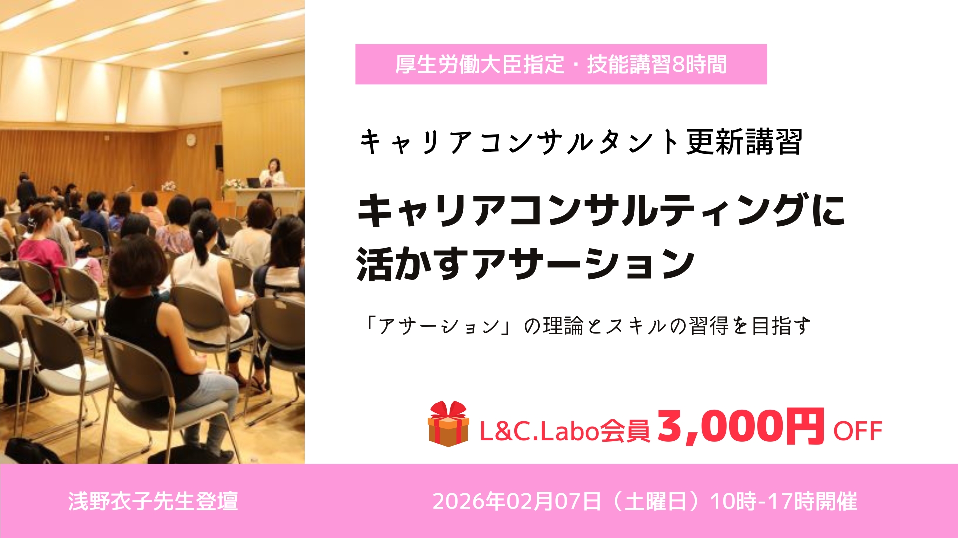 | 参加費 | キャリア・クロス会会員 12,000円(L&C.Labo会員は同額)(非課税) ※備考欄に『L&C.Labo会員』と書いていただくと会員価格で参加していただけます。 一般 15,000円(非課税) ※テキスト代を含まず |